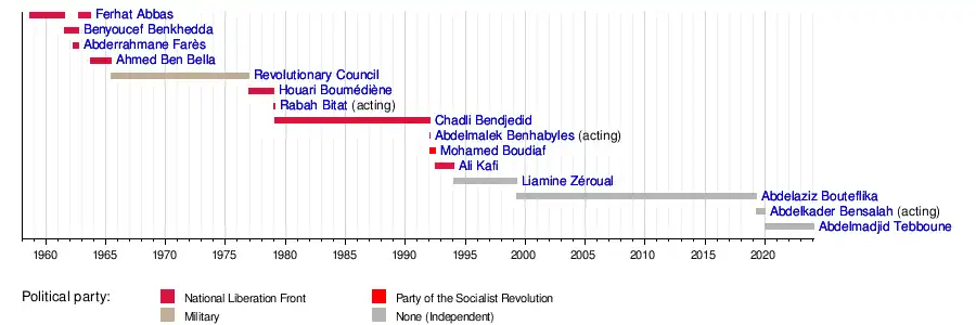This is a list of heads of state of Algeria since the formation of the Provisional Government of the Algerian Republic (GPRA) in exile in Cairo, Egypt in 1958 during the Algerian War, through independence in 1962, to the present day.