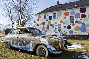 The Heidelberg Project is an outdoor art project in the McDougall-Hunt neighborhood on Detroit's east side, just north of the city's historically African-American Black Bottom area. It was created in 1986 by the artist Tyree Guyton, who was assisted by his wife, Karen, and grandfather Sam Mackey ("Grandpa Sam").[1] The Heidelberg Project is in part a political protest, as Tyree Guyton's childhood neighborhood began to deteriorate after the 1967 riots. Guyton described coming back to Heidelberg Street after serving in the Army; he was astonished to see that the surrounding neighborhood looked as if "a bomb went off".[2]
