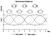 Between 1886 and 1889 Hertz conducted a series of experiments that would prove the effects he was observing were results of Maxwell's predicted electromagnetic waves. Starting in November 1887 with his paper "On Electromagnetic Effects Produced by Electrical Disturbances in Insulators", Hertz sent a series of papers to Helmholtz at the Berlin Academy, including papers in 1888 that showed transverse free space electromagnetic waves traveling at a finite speed over a distance.[20][21] In the apparatus Hertz used, the electric and magnetic fields radiated away from the wires as transverse waves. Hertz had positioned the oscillator about 12 meters from a zinc reflecting plate to produce standing waves. Each wave was about 4 meters long. Using the ring detector, he recorded how the wave's magnitude and component direction varied. Hertz measured Maxwell's waves and demonstrated that the velocity of these waves was equal to the velocity of light. The electric field intensity, polarization and reflection of the waves were also measured by Hertz. These experiments established that light and these waves were both a form of electromagnetic radiation obeying the Maxwell equations.[22]