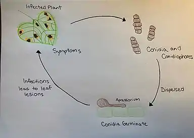 Germ tubes are produced by the conidia and grow across the leaf surface before forming an appressorium.[6] The fungus will then enter the host by penetrating through the cuticle and epidermis. It has also been observed that penetration through wounds and stomates can occur.[6] The conidiophores then develop through the collapsed stomates. Conidiophores are 12 to 50 micrometers long and rise singly or in branches.[7] The conidia will emerge through the stomata and trichomes.[4] At this stage, the conidia produced will cause secondary infection and spread to other healthy plants.[4] Under certain conditions, micro-cyclic conidia can be produced directly from the parent conidia.