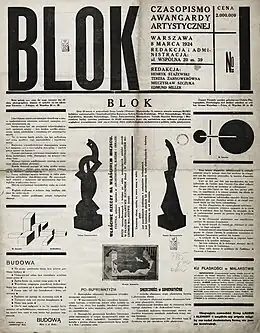 At Blok, Stażewski collaborated with Henryk Berlewi and Szczuka who were considered leading figures in Polish avant-garde typography. After Blok was dissolved in 1926 due to internal disagreements, Stazewski became one of the co-founders of the avant-garde collectives Praesens (1926–1929) and later a.r. group (1929–1936), both of which also became critical in defining the direction of Constructivism in Poland.[5] As a member of these groups, Stażewski contributed to Polish Constructivism through typography, posters, theoretical writings (including publications for the Blok magazine published between 1923 and 1926), as well as interior design and furniture design.[9] Though predominantly idealistic and of limited impact on the Polish post-World War I society, the Constructivists completed some important architectural projects (Praesens, for instance, participated in the design of apartment buildings for the Warsaw Housing Cooperative in the Rakowiec district)[7]: 123–124 and imbued the Polish avant-garde, up until then largely autonomous, with a sense of social commitment.[7]: 128