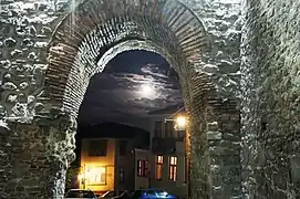 Hisar Kapia (from Turkish: Hisar Kapı meaning "Castle Gate") is a medieval gate in Plovdiv's old town and one of the most famous tourist sights in the city. The gate was built in the 11th century AD over the foundations of a gate from Roman times (probably from the 2nd century AD). Hisar Kapia is one of the three entrances (Eastern, Northern and Southern) to the acropolis of ancient Plovdiv. During the rule of the Ottoman empire revival houses were embedded in the remains of the old stone walls around the gate.[1]
