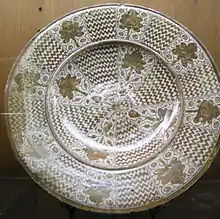 The earliest major centre of fine pottery in Al-Andalus was Málaga in southern Spain.[3] This is the major centre whose best-known wares were produced in a Muslim kingdom, as opposed to by a workforce presumed to be largely Muslim, or Morisco, under Christian rule. It was already celebrated for its gold lustrewares in the 14th century, and remained under Muslim rule until 1487, shortly before the fall of Granada, the last Moorish kingdom. Murcia, Almería, and perhaps Granada itself were also early centres of production.[4] This pottery stayed much closer to styles seen in other Islamic countries, although much of it was being exported to Christian markets, as can be seen by the coats of arms on many pieces.