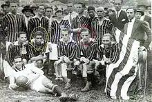 Clube Atlético Mineiro was founded on March 25, 1908 by twenty-two students from Belo Horizonte.[3] The founding players were: Aleixanor Alves Pereira, Antônio Antunes Filho, Augusto Soares, Benjamin Moss Filho, Carlos Marciel, Eurico Catão, Horácio Machado, Hugo Francarolli, Humberto Moreira, João Barbosa Sobrinho, José Soares Alves, Júlio Menezes Melo, Leônidas Fulgêncio, Margival Mendes Leal, Mário Hermanson Lott, Mário Neves, Mário Toledo, Raul Fracarolli and Sinval Moreira. Three other young men were not present in the founding meeting, but are also considered as founders of the club: Francisco Monteiro, Jorge Dias Pena and Mauro Brochado.[4] The founders decided that the club's name would be Athletico Mineiro Foot Ball Club.