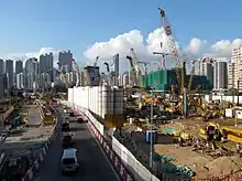 Construction of the West Kowloon station project was divided into two parts, XRL810A (northern part) and XRL810B (southern part)[21] (XRL meaning eXpress Rail Link). The northern construction area was awarded to Leighton Contractors & Gammon Construction responsible for joint operations.[22] The southern part of the project was awarded to a consortium of Laing O'Rourke, HCCG (Hsin Chong) & Paul Y jointly responsible for the construction.[23][24][25]