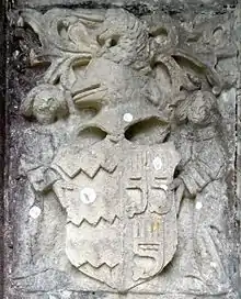 - ↑ Above is the crest of Basset A unicorn's head argent. The supporters are human figures representing dexter: Sir John Basset, and sinister: Honor Grenville. Detail from the Umberleigh House Porch, formerly part of the manor house of Umberleigh, North Devon, moved to the wall of the subtropical Gardens, Watermouth Castle, North Devon.[5]