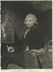 Hope & Co. was a Dutch bank that existed for two and a half centuries. The bank was located in Amsterdam until 1795; originally it concentrated on Great Britain. From 1750 it played a major part in the finances of the Dutch East India Company (VOC) through Thomas Hope and his brother Adrian. During the Seven Years' War (1756–1763) the Hope brothers profited from the Netherlands' neutral position and became very wealthy. The Hopes became heavily involved in the Dutch Caribbean, and Danish West Indies.[1] They specialised in plantation loans, in which the entire produce of the plantation was remitted to the lender, who would supervise its sale in order to secure repayment. In this way, the Hopes helped the plantation economy to become integrated into a global network of financiers and consumers.[2] The Hope family were among the richest in Europe at the time. The family business focused on financing commercial transactions and especially on issuing money loans to monarchs and governments in Denmark, Sweden, Poland, Russia, Portugal, Spain, France and America. The bank was famous for having Catherine the Great as their client and Adrian supplied her several times with diamonds.[3]