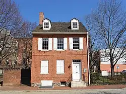House at 9 North Front Street is a historic home located in the Jonestown Historic District in Baltimore, Maryland, United States. It is a 2+1⁄2-story brick townhouse with a 2-story rear wing. It is three bays wide and two rooms deep. The main house features a gable roof with two dormers on each side and two interior chimneys connected by a parapet. The house is located at 9 North Front Street and was built by either John Beale Bordley or Charles Torrence circa 1790. The house was the residence of Thorowgood Smith, second Mayor of Baltimore (1804-1808). It rests on an area of downtown Baltimore traditionally known as “Old Town”. Even earlier on, it was known as “Jones Town”. This area was annexed to Baltimore in 1745 and its settlement predates that of Baltimore Town. More specifically, the house is located in a neighborhood known today as Shot Tower Park. Once part of a whole row of Conservative Conservative Georgian style brick masonry 2+1⁄2-story townhomes, this house is the last extant example on the street, and one of just a few 18th century townhouses remaining in all of Baltimore.[2]