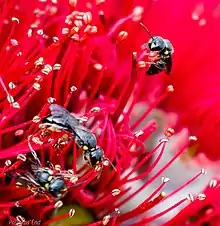 This bee species has a wide variety of both native and introduced host species.[1] Native species include Olearia angustifolia, Carmichaelia species, Peraxilla tetrapetala, Leptospermum scoparium, Metrosideros excelsa, Metrosideros robusta and Veronica salicifolia.