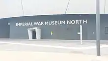 Imperial War Museum North (sometimes referred to as IWM North) is a museum in the Metropolitan Borough of Trafford in Greater Manchester, England. One of five branches of the Imperial War Museum, it explores the impact of modern conflicts on people and society. It is the first branch of the Imperial War Museum to be located in the north of England. The museum occupies a site overlooking the Manchester Ship Canal on Trafford Wharf Road,[2] Trafford Park, an area which during the Second World War was a key industrial centre and consequently heavily bombed during the Manchester Blitz in 1940. Just across the Trafford Wharf Road from the Museum is the bulk of the Rank Hovis Flour Mill, a survivor from a former industrial age and now rather out of keeping with the surrounding architecture.[3] The area is now home to the Lowry cultural centre and the MediaCityUK development, which stand opposite the museum at Salford Quays.