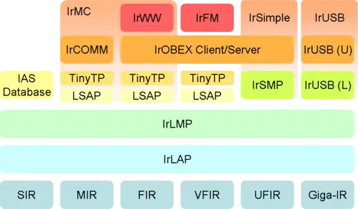 The optional IrCOMM (Infrared Communications Protocol) lets the infrared device act like either a serial or parallel port. It lies on top of the IrLMP layer.