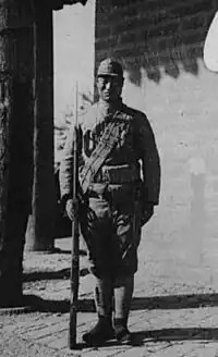 The early uniforms worn by Mongolian troops were their civilian clothing. Typical it consisted of a long blue padded cotton tunic that was worn which reached down to the ankles along with an orange sash around the waist. Headgear was either a lambs' wool hat or a colored turban wrapped around the head. The color of the turban varied with each Mongol banner clan having a distinctive one. In addition they wore a leather bandolier for cartridges which was slung over the left shoulder. Some soldiers were dressed in loose fitting cotton jacket and trousers along with a peak cap. In 1936 a new uniform was in use, modeled on the Nationalist Chinese uniform. It included a loose-fitting grey jacket and grey cotton trousers. A peaked grey cotton peaked cap was worn along with it (similar in appearance to those worn by the Russian Imperial Army during World War I). Other uniforms they used included the regular Japanese Army uniform but with Inner Mongolian insignia.[10]