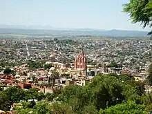 The town of San Miguel de Allende is about four hours drive north of Mexico City. It is named after General Ignacio Allende, a hero of the Mexican War of Independence. It is at altitude of 6,200 feet (1,900 m) and has a temperate climate.[1] The town was founded in 1542. It was flourishing by the 17th century, but in the late 18th century suffered from a severe economic crisis. The wealthy inhabitants moved elsewhere, and the town stagnated.[2] The institute brought new life to the town, which is now relatively prosperous.[2] San Miguel has cobblestone streets and old stone buildings, and has been designated a national historical monument.[1]