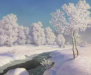 He painted spectacular snow scenes in which the light seems to come from behind the canvas and glow. The critics scorned these pictures as photographic and called them non-art – but today this style of painting is called "magic-realism" and is much admired by critics and museum people.[3]