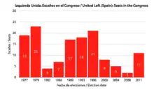 Following the electoral failure of the PCE in the 1982 (from 10% to 4%), PCE leaders believed that the PCE alone could no longer effectively challenge the electoral hegemony of the Spanish Socialist Workers' Party (PSOE) on the left.[6] With this premise, the PCE began developing closer relations with other left-wing groups, with the vision of forming a broad left coalition.[6] IU slowly improved its results, reaching 9% in 1989 (1,800,000 votes) and nearly 11% in 1996 (2,600,000 votes). The founding organizations were: Communist Party of Spain, Progressive Federation, Communist Party of the Peoples of Spain, PASOC, Carlist Party, Humanist Party, Unitarian Candidacy of Workers, and Republican Left.