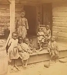 While documenting scenes from black communities, Palmer mostly stayed away from any kind of political commentary. He gave his images simple and descriptive titles.[6] However, there were also times in his career when he used his platform to champion the political rights of African-Americans, or, at the very least, to draw sympathy for them. In 1874, he took a stereograph of a poor black family he entitled "The way the negro race is dying out."[11] He titled another image of children from the same family " We are all, all hue."[12]