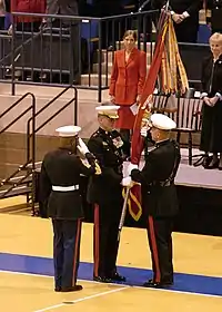 Change of Command ceremony, January 13, 2003. SgtMajMC Alford McMichael (left) salutes as General Jones (center) relinquishes command to General Michael Hagee (right)