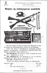 Between the wars, several Norwegian gunsmiths attempted to create harpoon guns,[2] intended for hunting seals and shooting rescue lines to boats in distress. Seeing a ready market, and having access to the several thousand Jarmanns in storage, Kongsberg Våpenfabrikk designed a harpoon gun referred to as the M28.[2]