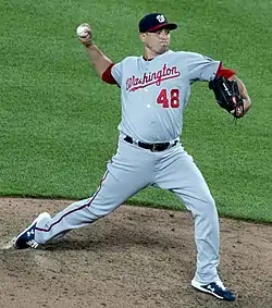 Guerra was claimed off outright waivers by the Washington Nationals on May 20, 2019.[22] He was designated for assignment on July 31, 2019. He had his contract selected for a second time on August 4, 2019. In 2019 with the Nationals he was 3-1 with one save and a 4.86 ERA in 40 relief appearances. Guerra pitched the ninth inning of Game 2 of the World Series, allowing a solo home run to Martín Maldonado in a 12-3 Nationals win over the Houston Astros.[23] He was non-tendered by the Nationals on December 2, 2019, making him a free agent. To remain in the Nationals organization, Guerra subsequently signed a minor league deal with an invitation to major league spring training.[24] On July 23, 2020, Guerra's contract was selected to the 40-man roster. On October 12, 2020, Guerra was outrighted off the roster and subsequently elected free agency.[25] On December 21, 2020, Guerra re-signed with the Nationals organization on a minor league contract.[26]