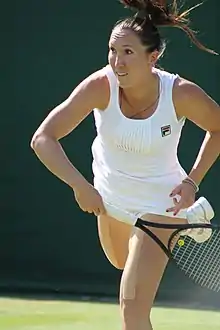 At Wimbledon, Janković injured her knee during her third-round match against Caroline Wozniacki.[15] Although she won that match, it visibly hindered her during her fourth-round loss to Tamarine Tanasugarn. Janković would have become the world no. 1 had she reached the semifinals of the tournament.[16] However, she lost to Tamarine Tanasugarn in the fourth round. Janković squandered two further opportunities to immediately take the world no. 1 position with losses in the semifinals of the East West Bank Classic in Los Angeles[17] to Dinara Safina and the quarterfinals of the Rogers Cup in Montreal, to Dominika Cibulková. Janković did eventually replace Ivanovic as the world No. 1 on 11 August 2008.[18] She was the 18th woman to have been ranked world No. 1 by the Women's Tennis Association, but the first woman to have done so without ever having reached a Grand Slam final and only the third woman (the others being Amélie Mauresmo and Kim Clijsters) to have become world No. 1 without first winning a Grand Slam title.[19][20]