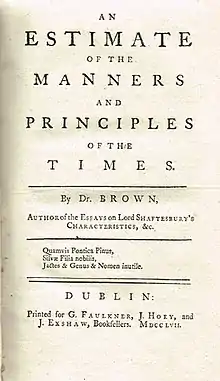 At Warburton's suggestion, Brown expanded the Essay on Satire, to an Essay (1751) on the Characteristicks of Anthony Ashley-Cooper, 3rd Earl of Shaftesbury. It is considered to have skewered Shaftesbury's deism and moral sense theory.[1] The "test of ridicule" was supposed to be a key part of Shaftesbury's doctrine; Warburton wanted it undermined, and gave Brown the task.[8] The Essay was dedicated to Allen, also a supporter of Anglican orthodoxy, and opponent of Shaftesbury.[9] It contains a defence of a utilitarian philosophy, praised later by John Stuart Mill.[3] The work was attacked, and Shaftesbury defended, in pamphlets by Charles Bulkley.[1] Brown's theoretical argument, that ridicule was a type of valuation incompatible with a role as truth value, was taken up by William Preston.[10]
