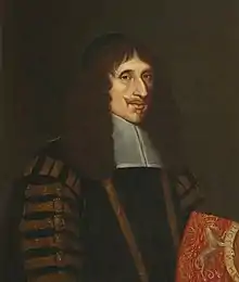 In August 1641 the King opened the Parliament of Scotland in person, the treaty with England was ratified, and offices and titles of honour were conferred on the "prime covenanters who were thought most capable to do him service".[5] Accordingly, "the principal manager of the rebellion", as Clarendon calls him, was appointed Lord Chancellor of Scotland on 30 September 1641, and on 2 October took the oath of office, and received from the King the Great Seal, which, since the resignation of John Spottiswoode, the Archbishop of St. Andrews, had been kept by the Marquis of Hamilton. A pension of £1,000 a year was also granted him, and his title of Earl of Loudoun was allowed him, with precedency from the date of the original grant. When the king found that the estates would not give their consent to the nomination either of the Earl of Morton or of Lord Almond, as lord high treasurer, the treasury was put into commission, and Loudoun appointed the first commissioner.[5]