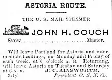 4. 1 2 3 4 Ainsworth, John C.; Oregon Steam Navigation Co. (November 10, 1866). "Astoria Route — The U.S. Mail Steamer John H. Couch". Oregon City Enterprise (advertisement). Oregon City, OR. p.3, col.4.