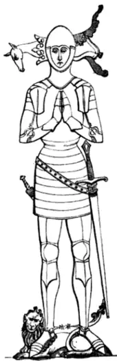 Historically Harpeden's death has often been mistakenly dated to 1457, but it took place on 8 May 1438.[1] He does not appear to have been of advanced age. He was buried in St. John the Evangelist’s chapel Westminster Abbey and his monumental brass is still located there in the north ambulatory of the choir, after being relocated in 1772.[3] His second wife Joan's monumental brass is in Cobham church.[1] Harpeden's excellent brass shows him in very simple plate armour surrounded by the shields impaling his arms, with those of his three wives and the last shows his arms.[4]