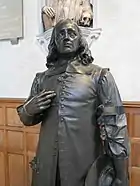 Milton died on 8 November 1674 and was buried in the church of St Giles-without-Cripplegate, Fore Street, London.[47] However, sources differ as to whether the cause of death was consumption or gout.[47][48] According to an early biographer, his funeral was attended by "his learned and great Friends in London, not without a friendly concourse of the Vulgar."[49] A monument was added in 1793, sculpted by John Bacon the Elder.