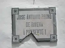 The postwar cult of personality had two ubiquitous icons. The first, a funereal slab placed on the external wall of many churches and cathedrals which bore the crowning inscription, Caídos por Dios y por España ("Fallen for God and for Spain"), followed by a list of local Nationalists killed during the war; Primo de Rivera's name headed every list.[38] The second was the rallying cry, "José Antonio¡Presente!," a figurative reply to an imaginary roll call invoking his ghostly attendance or immanence.