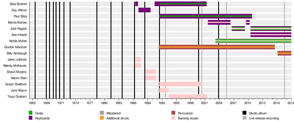 | Ray Thomas | 1964–2002 (died 2018)[23][14] |