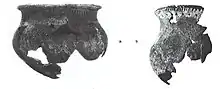 1,713 sherds were recovered, representing at least 631 vessels. This pottery is characterized by rounded, generally squat vessels with well-defined shoulders and tempered by coarse grit temper. Surface finish is generally cord-wrapped paddle impressed with decorations applied by cord-wrapped paddle or twisted cords and punctates. No collars or castellations appear during this phase. Similar pottery dating to the Late Woodland has been reported from the Heins Creek site in Wisconsin.[4][9]