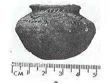 Eleven sherds representing a single vessel were present at Juntunen.[4] Ramey Incised is a Middle Mississippian pottery type first identified at the Cahokia Old Village site in southern Illinois. It has also been recovered at Carcajou Point in Wisconsin, but its presence at Juntunen marks the northernmost occurrence of any Middle Mississippian pottery type. Tempering is shell-tempered mixed with grit and decoration is a distinctive pattern of curvilinear designs. The vessel shape is thought to be a bowl with sharply defined shoulder. It was recovered in intermediate strata between the Bois Blanc and Juntunen Phases.[4][13]