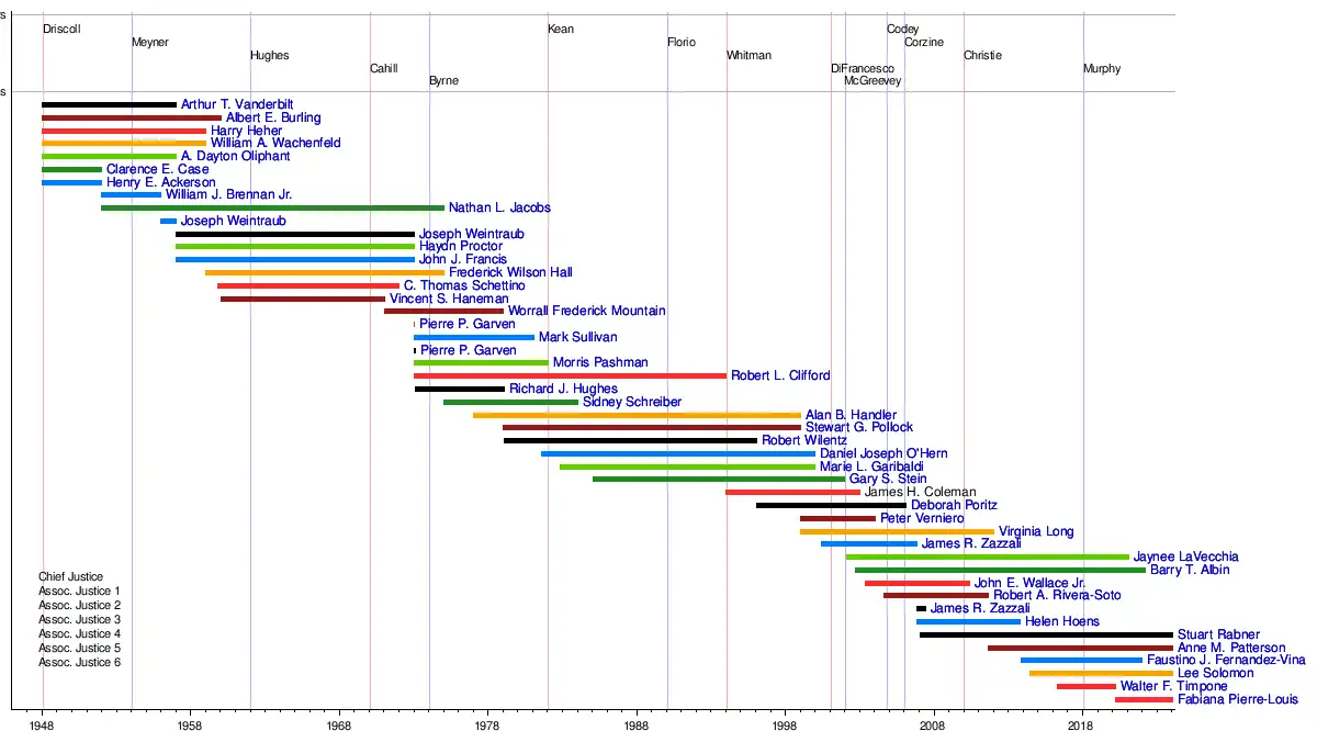 - 1 2 3 At the end of their initial seven-year term, the justice was renominated for tenure and was confirmed by the New Jersey Senate to serve until the mandatory retirement age of 70.