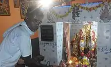 The deities themselves are often represented as aniconic, either as a shapeless stone or tree or snake-hole.[2] In Tamil Nadu, the guardian god is often given form as a fierce warrior, holding an aruval or other weapon, with attendants surrounding him. However Poturaju in Telugu areas is typically represented only by a stick in the ground. In Telugu and Kannada regions, the goddess is often given anthropomorphic form as a terracotta statue only during a temple festival, and is then returned to her aniconic shape. In many villages in Tamil Nadu, a village god is represented by planting spears or trishulas in the ground to represent his martial prowess. In the village of Kogilu near Bengaluru, the goddesses were represented by items such as a lamp or a stone pillar. In many areas of South Karnataka, the village goddess is symbolized by an aarti, a lamp made of rice flour shaped like a cone and adorned with kumkuma in the shape of a face.[3] All these icons are believed to be the deity itself, rather than simply a vessel to hold it.