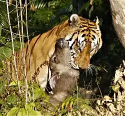 Kaziranga is one of the few wild breeding areas outside Africa for multiple species of large cats, such as Bengal tigers and Indian leopard.[29] Kaziranga was declared a Tiger Reserve in 2006 and has the highest density of tigers in the world (1 per 5 km2), with a population of 118, according to the latest census.[30] Other felids include the jungle cat, fishing cat and leopard cat.[29] It is also the only place in India and the world, where a Golden tiger was spotted in the wild.[37]
