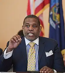 In April 2010, Parker launched into a tirade while white colleague, Republican Senator John DeFrancisco of Syracuse, was questioning a Black nominee for the New York State Power Authority at a confirmation hearing.[55] He objected to DeFrancisco's questions and asserted that he had never seen a white nominee treated in similar fashion.[56] "Amid the nearly two-minute tirade, committee chairman Carl Kruger told Parker he would be removed from the hearing room if he didn't settle down".[56] Parker responded: "Well, you better bring people".[57] During the tirade, Parker accused his colleagues of racism. He followed up in a radio interview by accusing DeFrancisco and Parker's Republican "enemies" of being white supremacists,[58][36][59][60] but later apologized for the "white supremacists" accusation.[61] His fellow Democrat, then-Senator Rubén Díaz Sr., himself a member of a racial minority group, opined that Parker "needs help".[62] The New York Times editorial board, writing that Parker was "known as the man with frightening rages that could erupt at any time and on almost any subject," opined that "Mr. Parker should be censured, and voters in central Brooklyn should start recruiting a qualified replacement."[55]