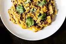 Khichdi or khichri (Urdu: کھچڑی, romanized: khicṛī, Hindi: खिचड़ी, romanized: khicṛī, pronounced [ˈkʰɪtʃɽiː], Bengali: খিচুড়ি, romanized: Khicuṛi, Odia: ଖେଚୁଡି) is a dish in South Asian cuisine made of rice and lentils (dal) with numerous variations. Variations include bajra and mung dal khichri. In Indian culture, in several regions, especially in the northern areas, it is considered one of the first solid foods that babies eat.[1][2][3]