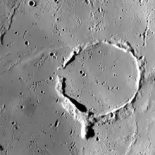 ![]() Lunar Orbiter 4 image (Dark triangle at upper rim is blemish on original photo) | |