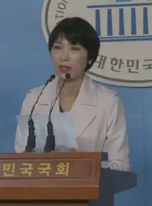Born in 1979, Kim holds a bachelor's degree in law from Yonsei University,[1] as well as a master's degree in feminist politics of Kookmin University.[2] She entered to politics when she was brought as a female specialist to the Democratic Unionist Party (DUP) in 2012.[1][2] She quit the party due to her objection towards pro-Moon Jae-in faction of the party.[2] She then became closer to Ahn Cheol-soo, who later formed the New Politics Alliance for Democracy (NPAD) in which she also joined.[2]