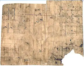 Plans for the Kirtland House of the Lord. On the other side are pasted ancient Egyptian Papyri Fragments, part of the collection Joseph Smith used to translate the Book of Abraham[6]