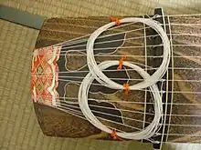 The koto (箏) is a Japanese plucked half-tube zither instrument, and the national instrument of Japan. It is derived from the Chinese zheng and se, and similar to the Mongolian yatga, the Korean gayageum and ajaeng, the Vietnamese đàn tranh, the Sundanese kacapi and the Kazakh jetigen.[1] Koto are roughly 180 centimetres (71 in) in length, and made from Paulownia wood (Paulownia tomentosa, known as kiri). The most common type uses 13 strings strung over movable bridges used for tuning, different pieces possibly requiring different tuning. 17-string koto are also common, and act as bass in ensembles. Koto strings are generally plucked using three fingerpicks (tsume), worn on the first three fingers of the right hand.