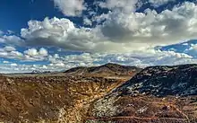 The volcanic system of Krýsuvík (or Krísuvík, both pronounced [ˈkʰriːsʏˌviːk] in Icelandic), also Krýsuvík-Trölladyngja [ˈtʰrœtlaˌtiɲca] volcanic system, is situated in the southwest of Iceland on the Reykjanes peninsula. It is located in the middle of Reykjanes and on the divergent plate boundary of the Mid-Atlantic Ridge which traverses Iceland. It was named after the Krýsuvík area which is part of it and consists of a fissure system without a central volcano.[1] However, there are some indications—namely, the discovery by geophysical methods of what scientists interpret as a buried caldera, combined with the well-known, vigorous hydrothermal system above it—that an embryonic central magma chamber may already exist or be actively developing.[2]