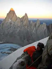 ![]() Kristoffer Szilas at a bivouac during an ascent of Cerro Torre in Patagonia. | |