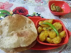 Meat is also prepared but the recipe is quite similar to the way it is prepared in most of North India.[7] Several snack items, breads, dairy products and beverages form the heart of the Kumaoni cuisine which is traditionally eaten in several parts in Uttarakhand.[8]