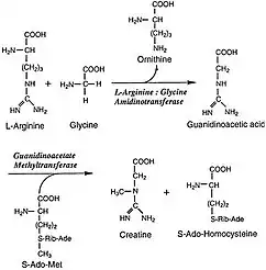 {{cite book}}:|journal=ignored (help) - ↑ Wyss M, Kaddurah-Daouk R (July 2000). "Creatine and creatinine metabolism". Physiol. Rev. 80 (3): 1107–213. doi:10.1152/physrev.2000.80.3.1107. PMID 10893433.
