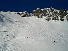Le Pas de Chavanette, also known as the "Mur Suisse" or "Swiss Wall", is a particularly steep and difficult piste in the Portes du Soleil ski area, on the border between France and Switzerland. It can be reached from the French resort of Avoriaz and from the Swiss towns of Les Crosets and Champéry. Effectively, one starts the run standing on the Swiss-French border, plunging down the Swiss side of the mountain towards Les Crosets.