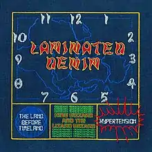 The album's title is an anagram of the title of the band’s 19th album, Made in Timeland, whose digital release coincided with the release of Laminated Denim. Described by the band as a "spiritual successor" to Made in Timeland,[2] Laminated Denim features two 15-minute songs written around the ticking of a clock, but featuring more rock-focused instrumentals with heavy use of polyrhythms[3] and a Motorik beat. Its psychedelic and progressive rock sound differs from the electronic-based Timeland.