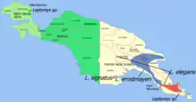 | Distribution map of L. elegans and other species of Leptomys on New Guinea: Leptomys elegans | |