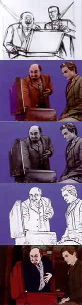 The game is notable for its unique art style, with characters illustrated in the "art nouveau" style that was popular in 1914, the year the game's events take place.[5] Since illustrating a game of this magnitude by hand would likely take an exorbitant amount of time, the look was achieved by using rotoscoping, a process that Mechner had used in Prince of Persia.[10] During a 22-day-long live-action video shoot, every action by every character in the game was photographed by actors wearing distinctive makeup and costumes against a bluescreen on 16mm film and digitized. From this, a limited number of frames were selected and put through a patented process developed in house, where the frames first had all their colour removed. Next, a powerful computer program created black-and-white line drawings of the frames; these were coloured by hand.[7][11] The finished product has 40,000 frames.[12]